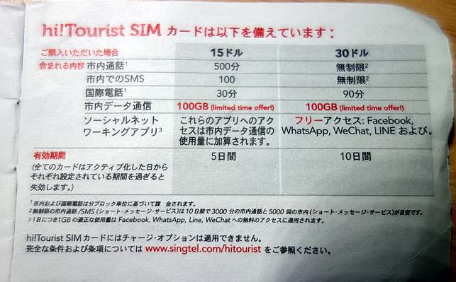5日間の期間限定SIMでも 100GByte も使えるようです。1シンガポールドル=86円で計算して、わずか1290円です。
