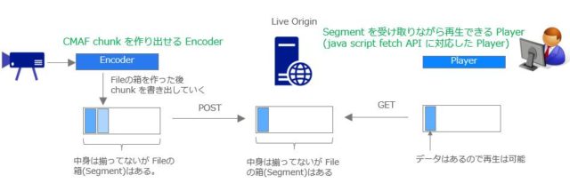 一方で、低遅延を目指すためには Player側はセグメント全体(HTTP レスポンス全体) を受け取る前に、受け取ったデータ分だけでも、再生処理をしたいという要求があります。
