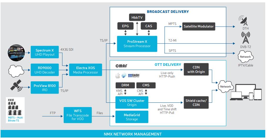 この図では、"Electra XOS" で CMAF Chunk を作成して CDN に HTTP で Ingest (PUSH)する方法と(この場合は、CDN側がオリジンを準備している前提)、クラウド上の "VOS SW Cluster Origin" で CMAF Chunk を作成し、そこをオリジンとしてCDN 側から PULL してもらいエンドユーザーに届ける2通りの方法で対応しているそうです。