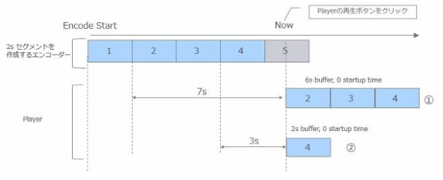 Player側で3つセグメント(2秒x3)をバッファーとして保持する設定は、ネットワーク環境が悪くなり、次のセグメントが取得できず再生が停止してしまう事できるだけ防ぐための仕組みです。コーディングによるものなので、ネットワーク環境が安定している場合、バッファーを1セグメント(2秒)だけにする事もできます。