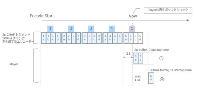 ユーザー視点では動画の再生開始時に待たされる事になりますが、1.5秒待つ事で[6a]のChunkができあがっているはずです。この方法だとLiveからの遅延は 500msecまで短くする事ができます。はじめの動画の再生開始を敢えて遅らせる事で、Liveとの視聴の時間差を短くする事が可能です(この仕組みは CMAFに限った事では無く、通常のDASH / HLSでも同じです)